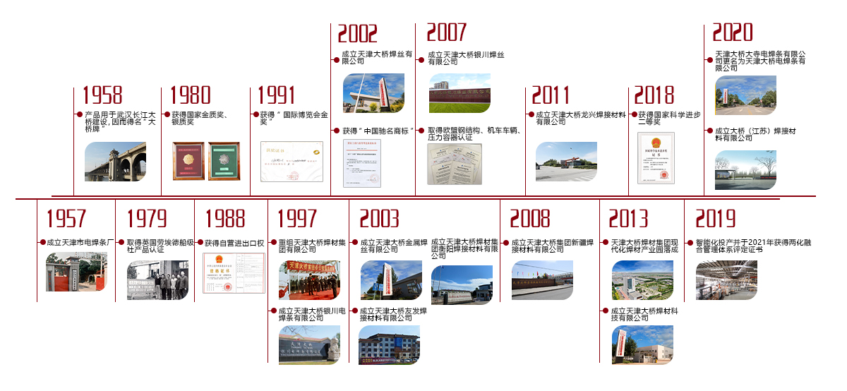 天津市電焊條廠創(chuàng)建于1957年。1958年,共和國橫跨長江的第一座大橋——武漢長江大橋選用天津市電焊條廠焊材,這是國產焊條首次應用在國家重點工程中,“大橋牌”由此誕生。1997年,天津市鈦鐵實業(yè)總公司與天津市電焊條廠實行股份制重組,正式創(chuàng)立天津大橋焊材集團有限公司。